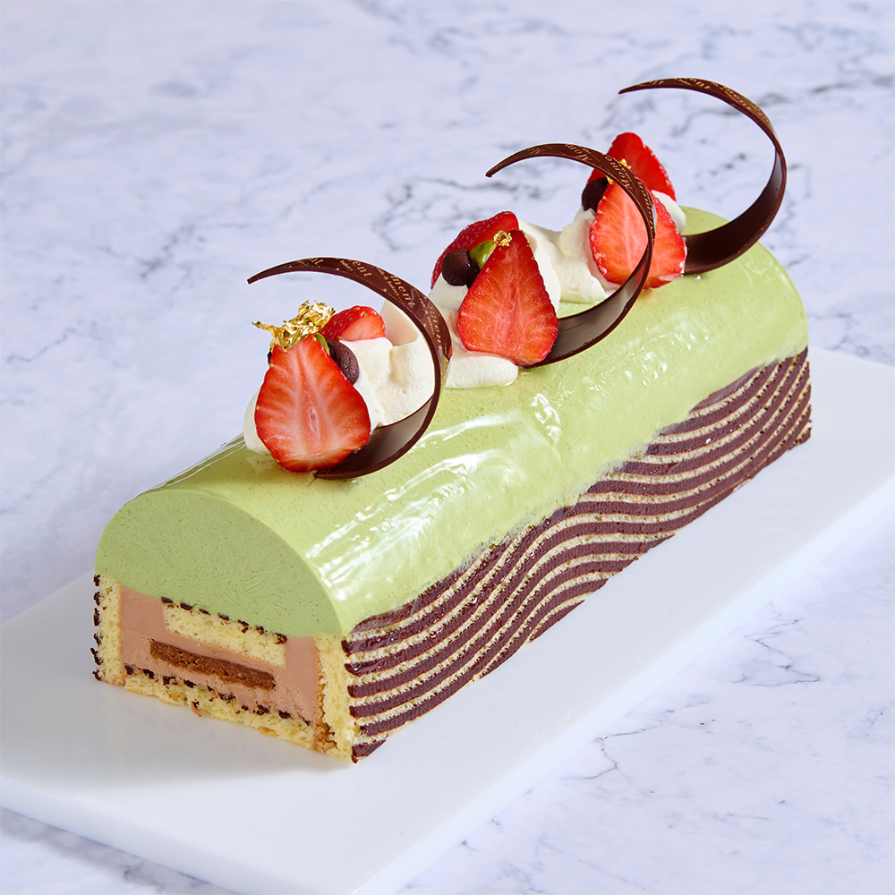 以西西里開心果製成的細緻慕斯為主體,入口柔滑,中層藏有巧克力榛果脆片,為口感增添清脆層次,側邊以巧克力勾勒線條,讓巧克力風味在每一口中悄然展開,滑順與酥脆交織,開心果與巧克力相互襯托,是一款層次分明的慕斯蛋糕。