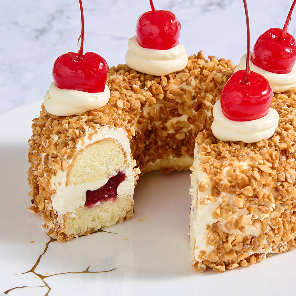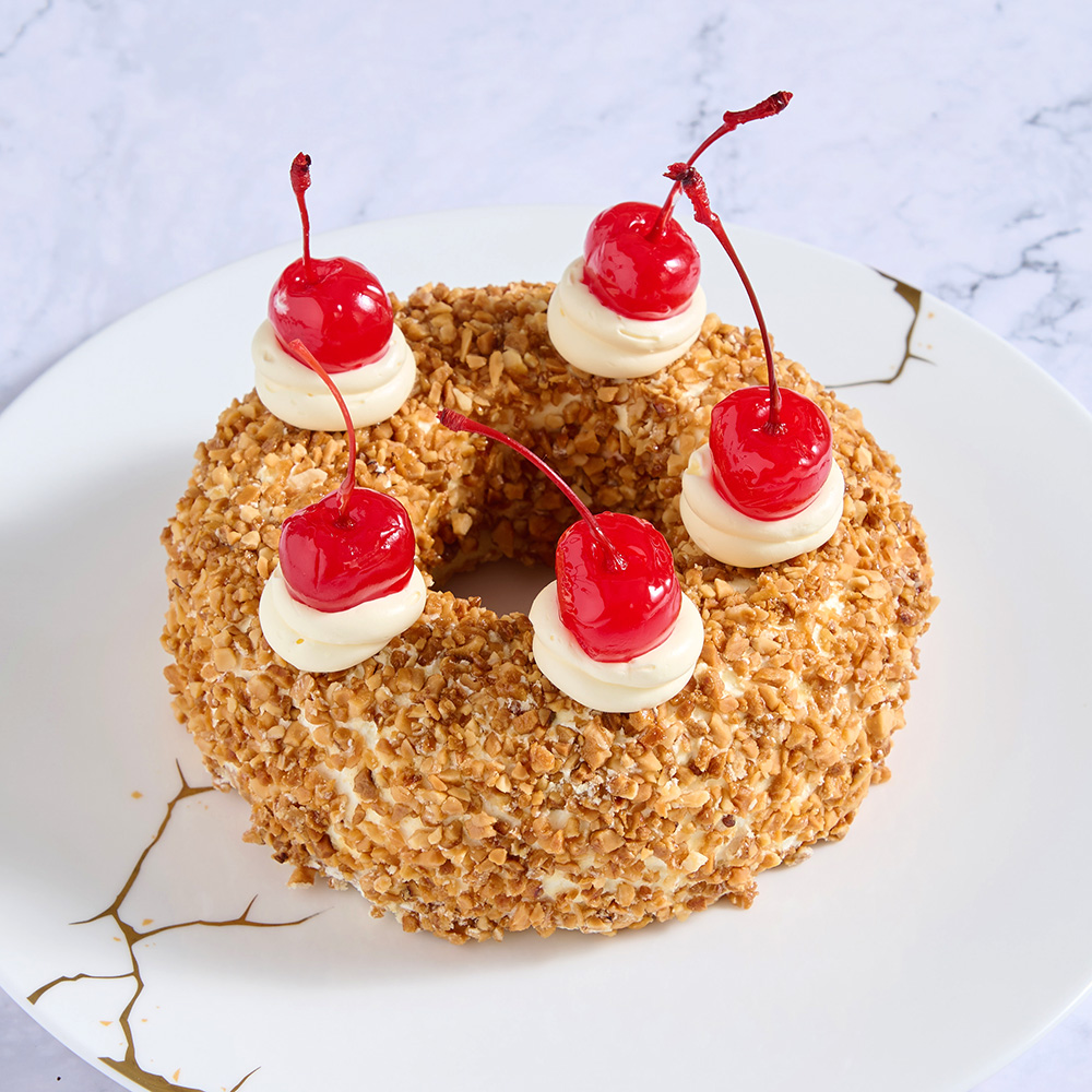 法蘭克福花圈蛋糕(Frankfurter Kranz)源自德國,由於法蘭克福曾是神聖羅馬帝國皇帝的加冕之城,被視為「皇冠之城」,因此這款甜點以花圈造型呈現,象徵皇權與榮耀;德文Kranz為「皇冠」之意,蛋糕外層的焦糖堅果象徵皇冠的金色光澤,而櫻桃則如同鑲嵌其上的紅寶石,為整體增添畫龍點睛的細節。