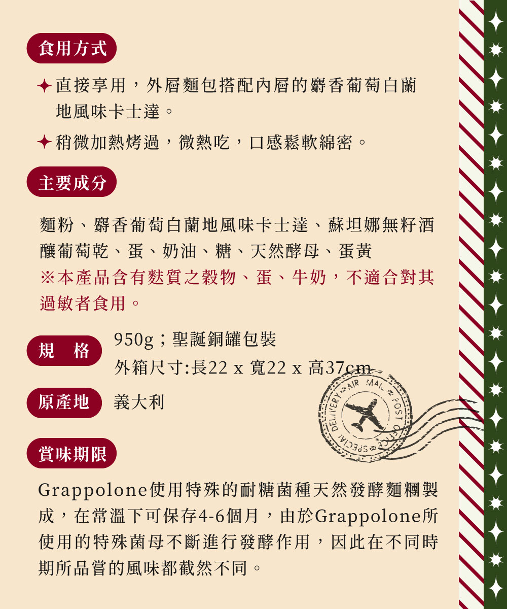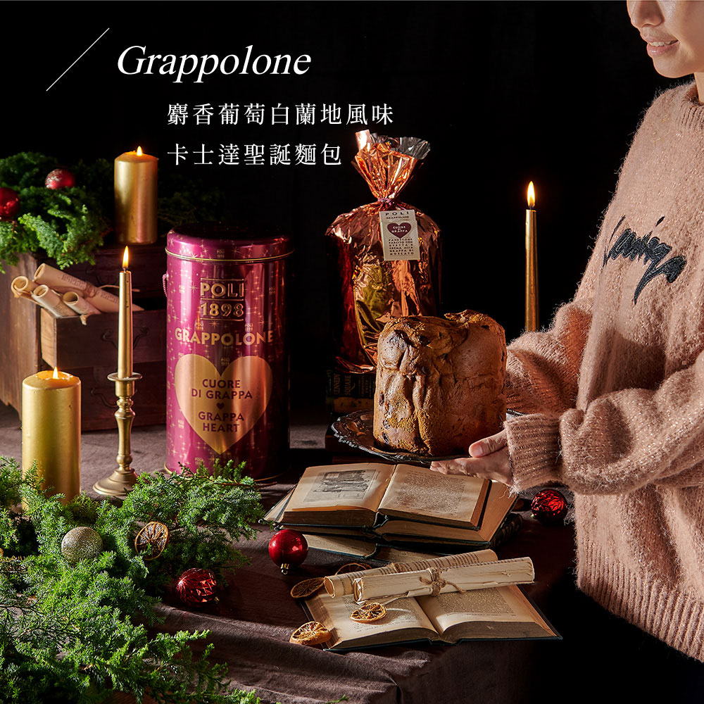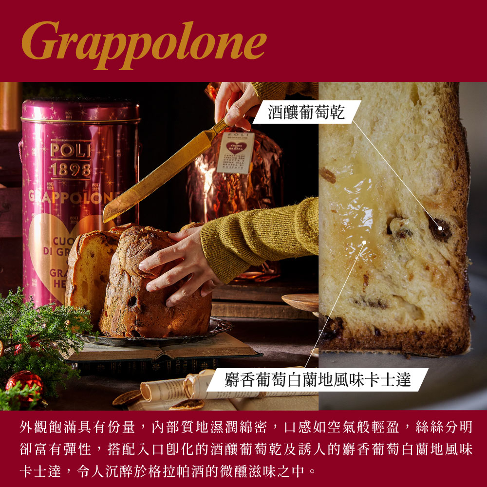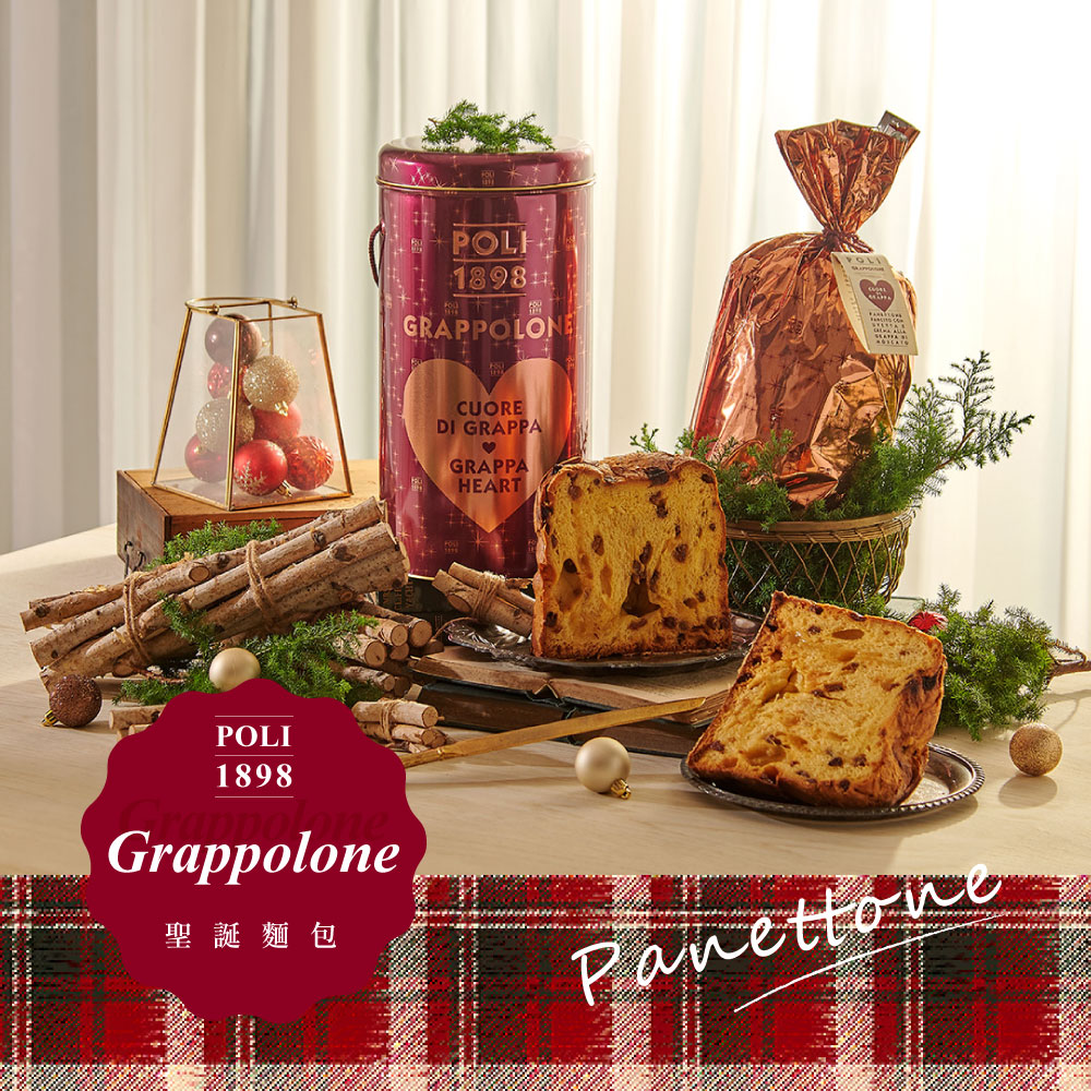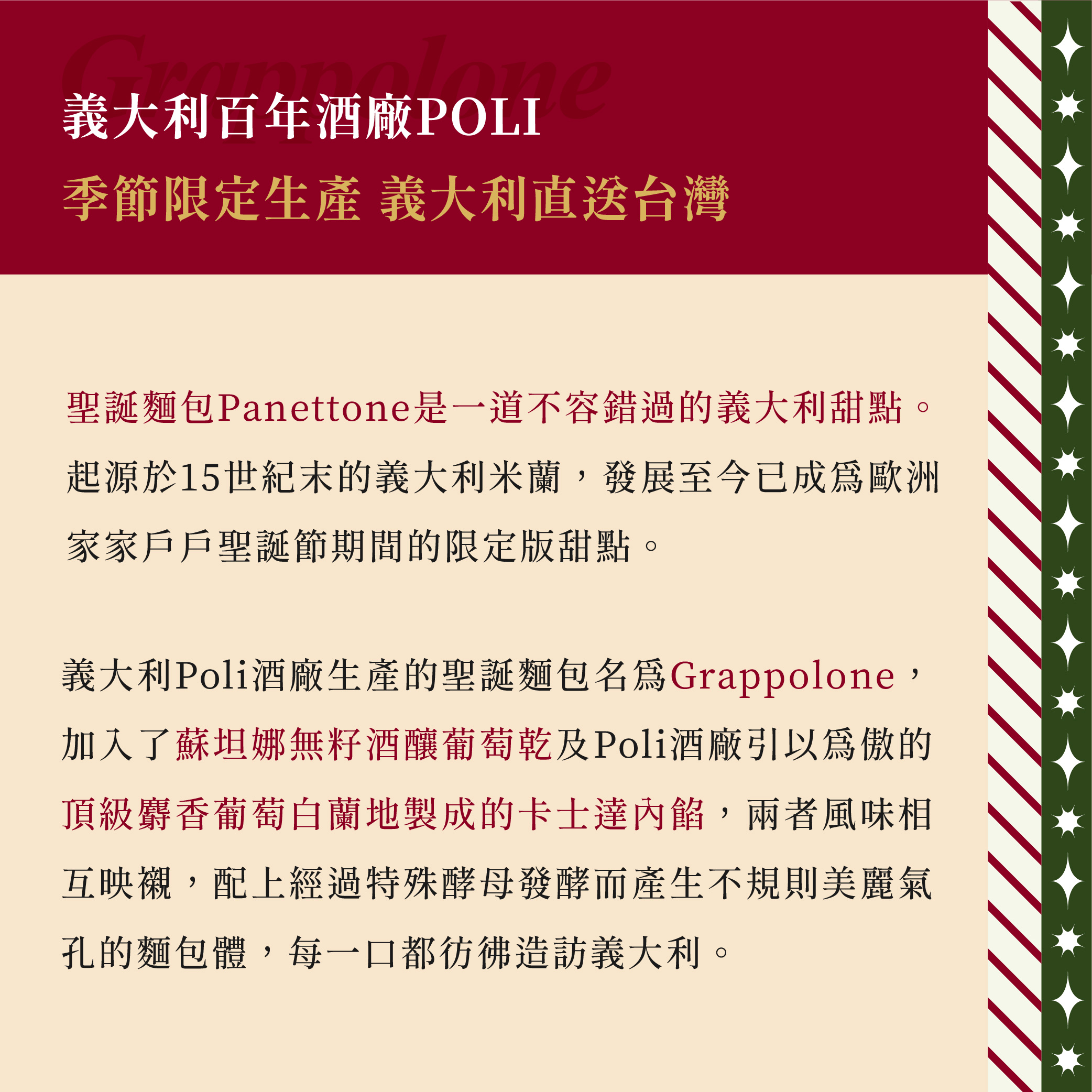 Panettone 是一道義大利家家戶戶聖誕節的限定版甜點,加入了蘇坦娜無籽酒釀葡萄乾及Poli酒廠引以為傲的頂級麝香葡萄白蘭地製成的卡士達內餡,極品美味千萬不可錯過,每一口都彷彿造訪義大利。