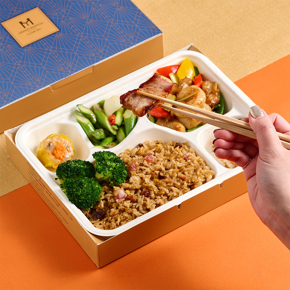 米食提供香氣四溢的臘味炒飯,佐爽脆西蘭花,鹹香交織更添風味。配菜有手工經典燒賣,口感清脆百合蘆筍,帶來恰到好處的鮮甜滋味;XO醬炒蝦球與干貝完美結合,為粵菜的常見菜色,鮮香海味十足;搭配蜜汁叉燒肉,外層焦糖色澤誘人,肉質軟嫩入味,甜鹹交織,道地粵式料理的醇厚風味,匯聚於這款珍選佳餚。