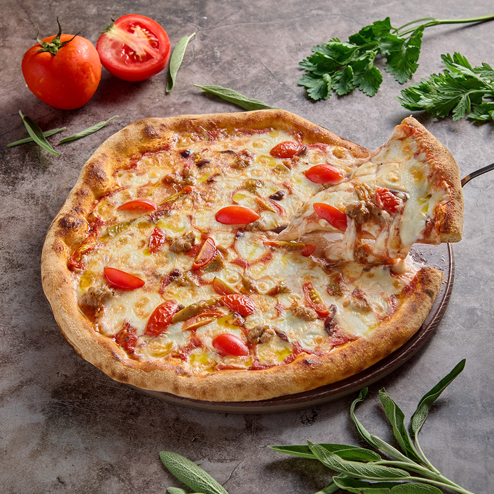 嚴選義大利經典食材,番茄醬與瑪芝瑞拉起司完美融合,搭配豬肉、洋菇、聖女番茄與黑橄欖,以手工餅皮經高溫窯烤呈現金黃外皮與微脆邊緣,入口充滿濃郁起司香、番茄鮮甜與豬肉鹹香的完美平衡,簡單卻極致的義式風味,是喜歡義大利道地披薩不容錯過的口味。