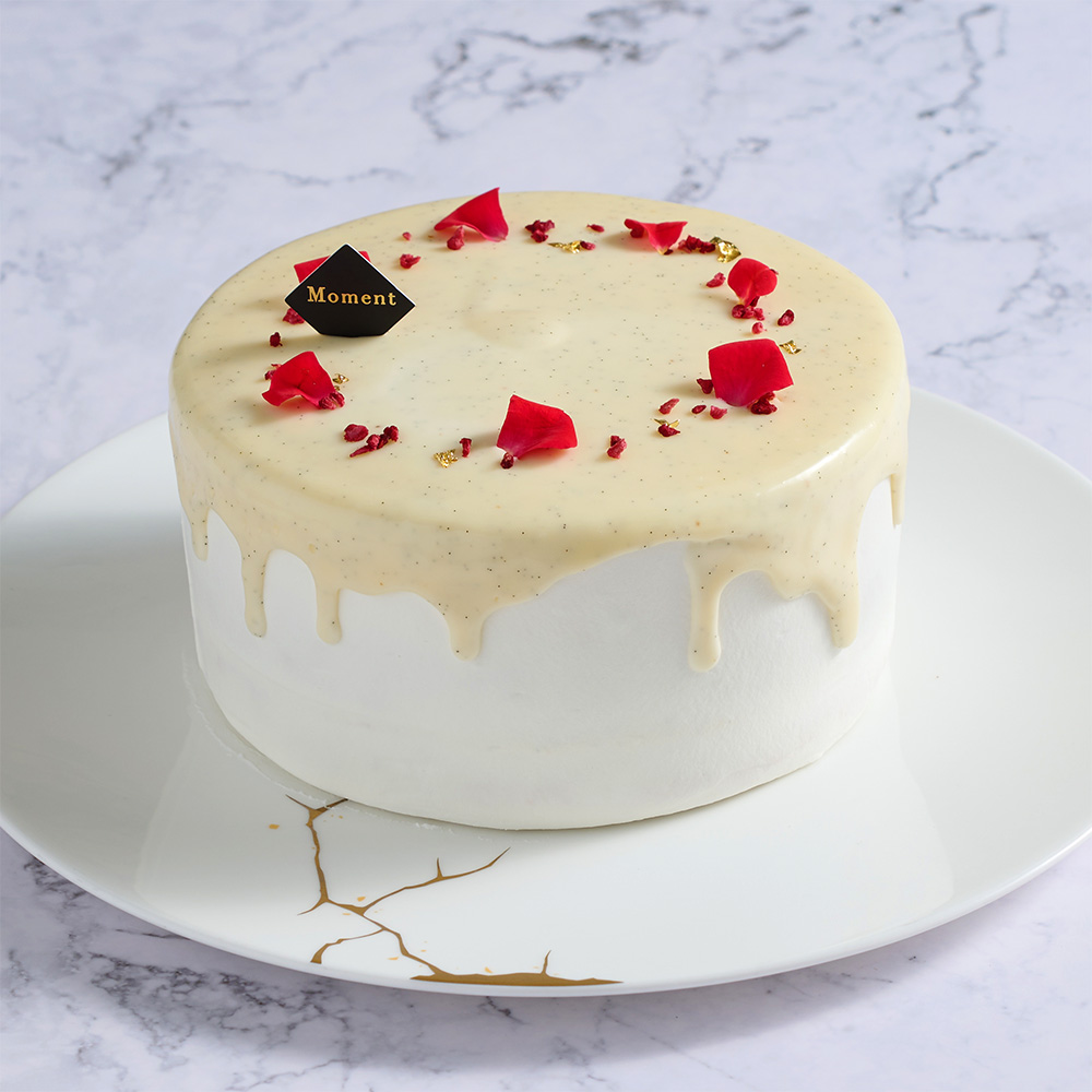 細緻滑順的香草淋面輕柔包覆,玫瑰花瓣與金箔點綴其上,勾勒出優雅浪漫的法式風情。酸甜濃郁的覆盆子醬,交織柔滑奶酪凍與香草奶凍,層層堆疊於鬆軟戚風蛋糕中,底部的沙布列餅乾口感酥脆,打造層次豐富的味蕾體驗。