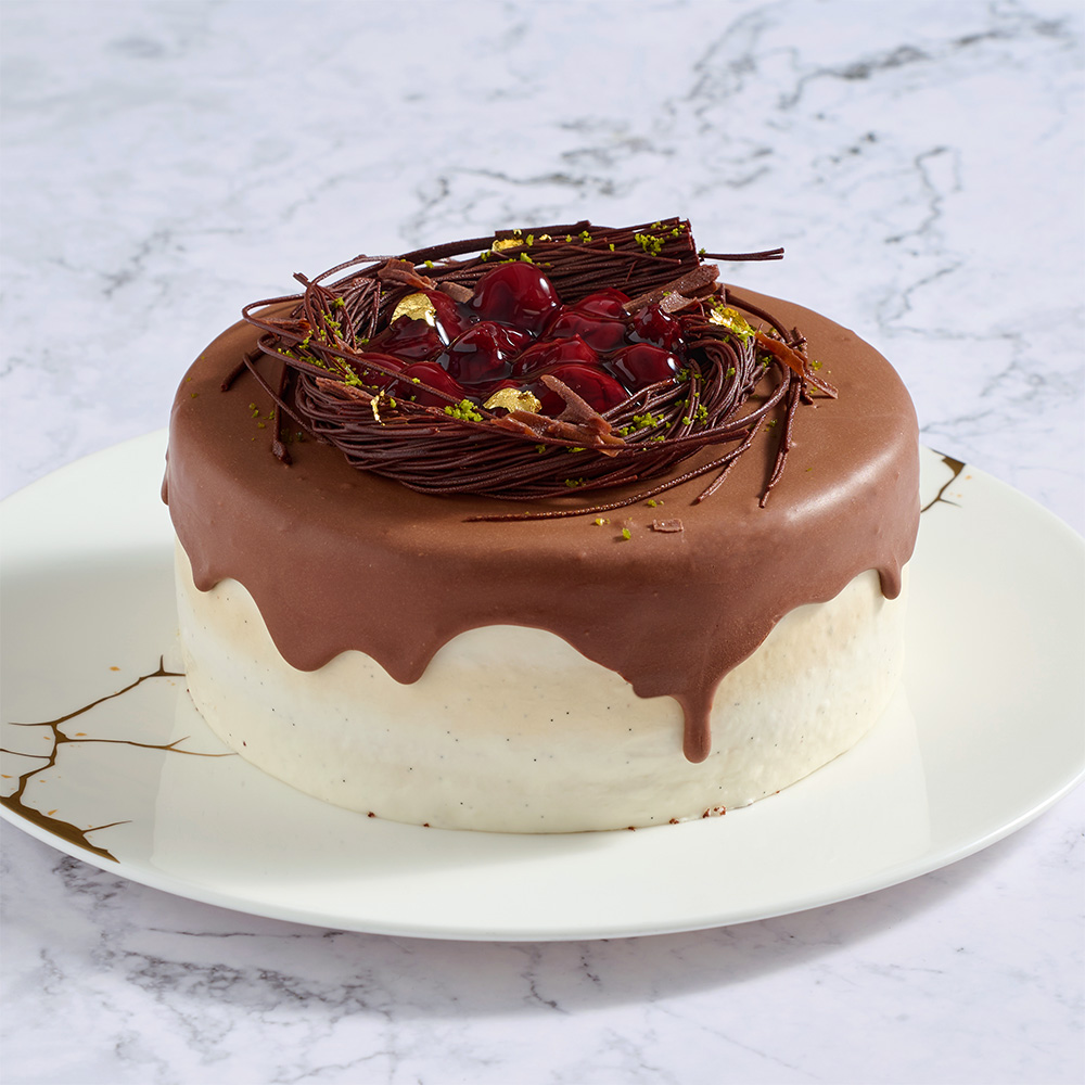 香甜的櫻桃內餡,搭配滑順鮮奶油與櫻桃香堤,覆上絲滑巧克力淋面,頂部以精緻巧克力製成鳥巢狀,與新鮮櫻桃點綴,香醇的巧克力蛋糕,每一口都是層層堆疊的幸福滋味。