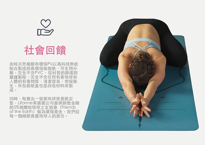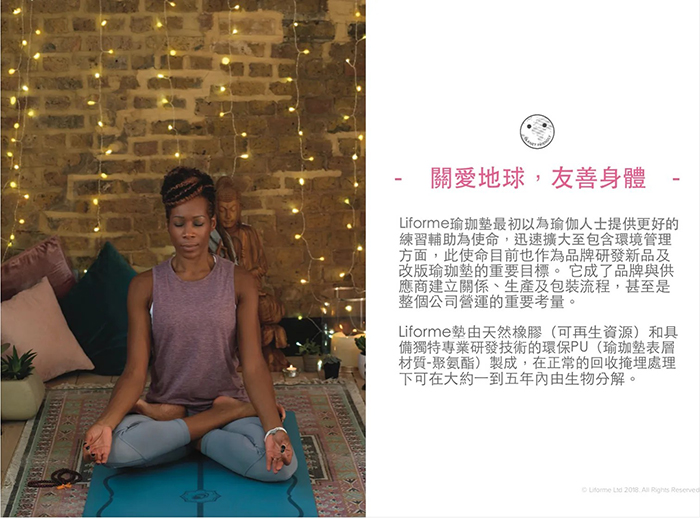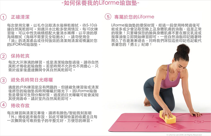 1.Liforme 瑜伽墊的表層是模仿人體肌膚的觸感,以達到最佳穩定和防滑效果,故隨著練習而來的是汗水留下的勇士印記;同時在受到尖銳物品或外力衝擊時受到損傷在所難免,,敬請理解。