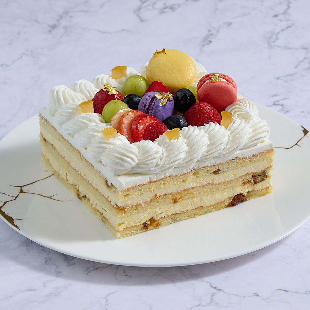 細緻柔滑的檸檬奶油鋪展,綴以藍莓、草莓和葡萄,交織覆盆子、檸檬與黑醋栗馬卡龍,多重果香堆疊出酸甜交融的繽紛風味。蛋糕採用胡桃入餡,香氣濃郁,口感紮實,夾層中能嚐到胡桃顆粒,增添層次口感,酸香主調貫穿整體,清爽不膩,為日常注入一抹優雅果韻。