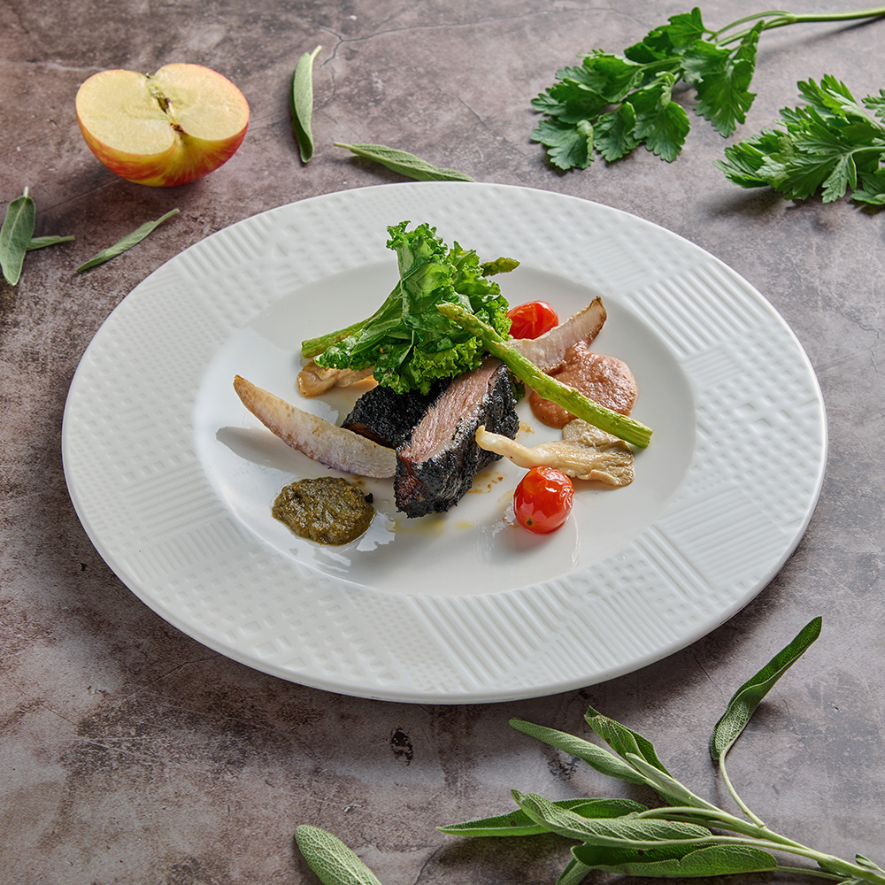 以舒肥工法鎖住伊比利老饕豬的細緻肉質,經竹炭料理增添獨特香氣與深邃色澤,搭配酸豆醬的微鹹清爽,及瑪莎拉酒蘋果醬的果香甜韻,佐爐烤時蔬,增添清新層次,完整呈現一份融合精湛手藝與獨特風味的西式饗宴。