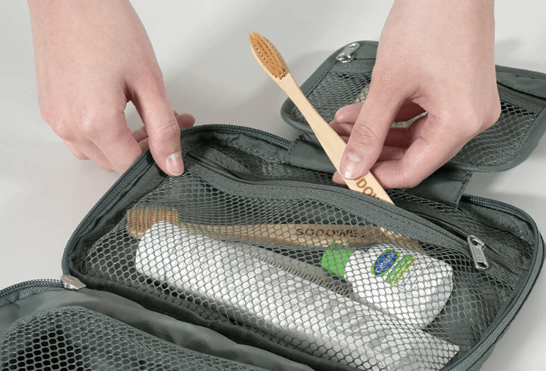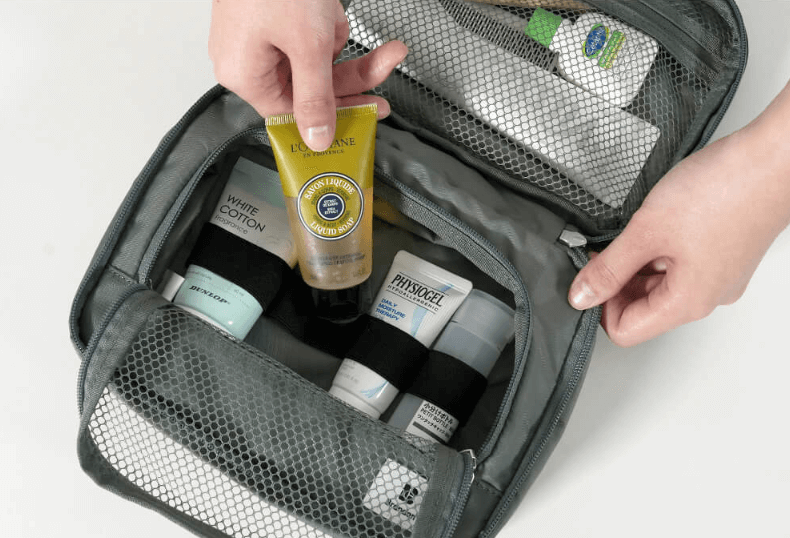 第二層(中間網袋):收納扁平類的產品,如護手霜、牙刷、牙膏、扁梳…寬扁用具