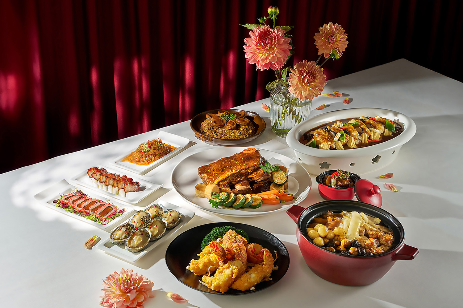 團圓圍爐輕鬆上菜,行政主廚推出適合四至六人的團圓桌菜,前菜有紅梅百花烏魚子、藤椒鮑魚及紅油蹄筋等五道菜色,搭配鮮活海味金沙原隻龍蝦身、柱侯黃燜燒龍膽石斑,以及招牌菜古法慢滷美國Prime帶骨牛小排,膠質豐厚的花膠佛跳牆與鑊氣十足的松露醬鮑魚雞粒炒飯。