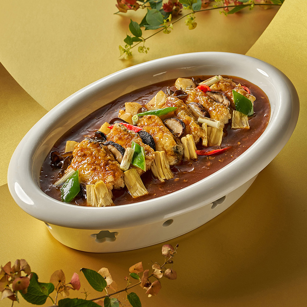 肉質紮實細緻,油脂豐美的龍膽斑,以添加有八角、花椒等材料的黃豆醬、紹興酒及高湯燜煮,甘甜的豆香提鮮增味,層次豐富。