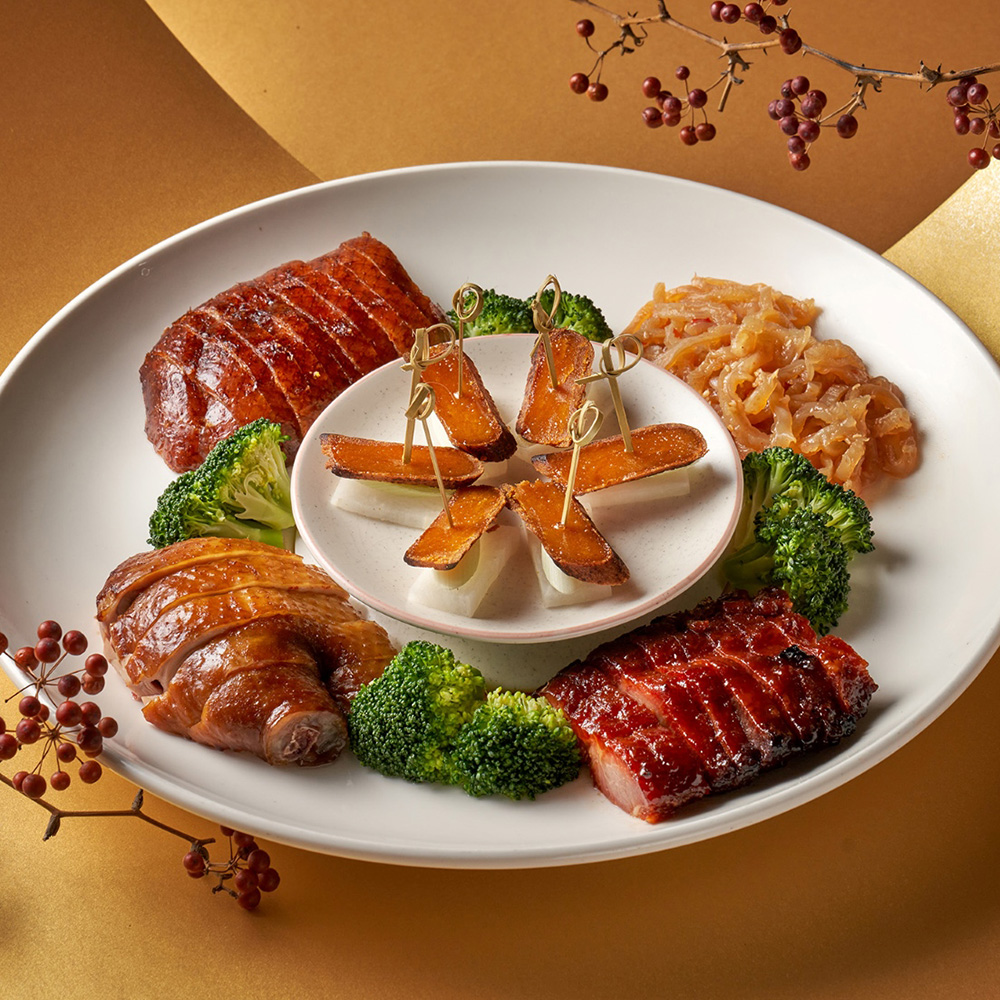 宴席前菜精選餐廳招牌燒鴨、油雞與港式叉燒,再搭配清爽脆口的海蜇絲及鮮味豐潤的烏魚子,海陸美饌福氣上桌。