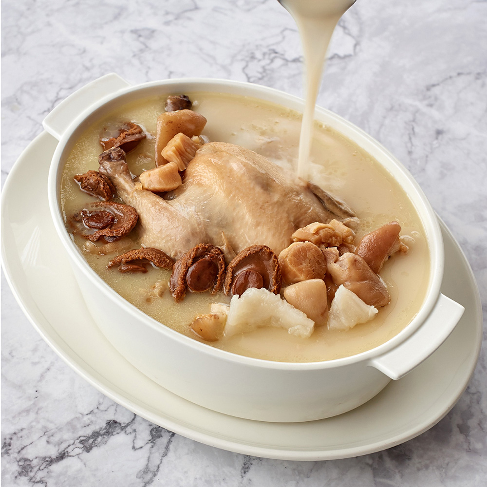 選用老母雞及雞骨等慢火燉煮八小時的精華上湯,搭配鮑魚、花膠、土雞及豬腳等食材煨煮,湯頭香濃鮮甜,膠質豐厚。