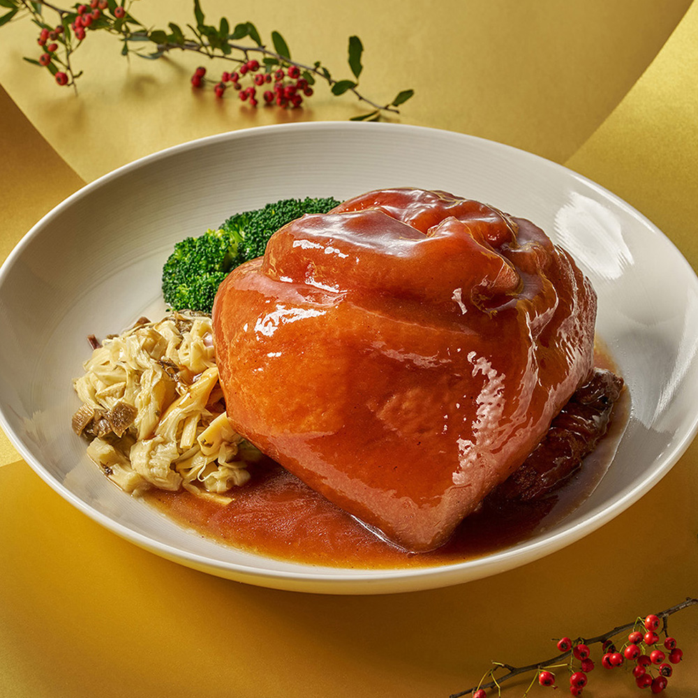 象徵財富豐盈的蹄膀,以紅燒方式烹煮至皮Q肉嫩,膠質豐潤,再搭配以高湯滷製的筍絲,經典年菜美味上桌。