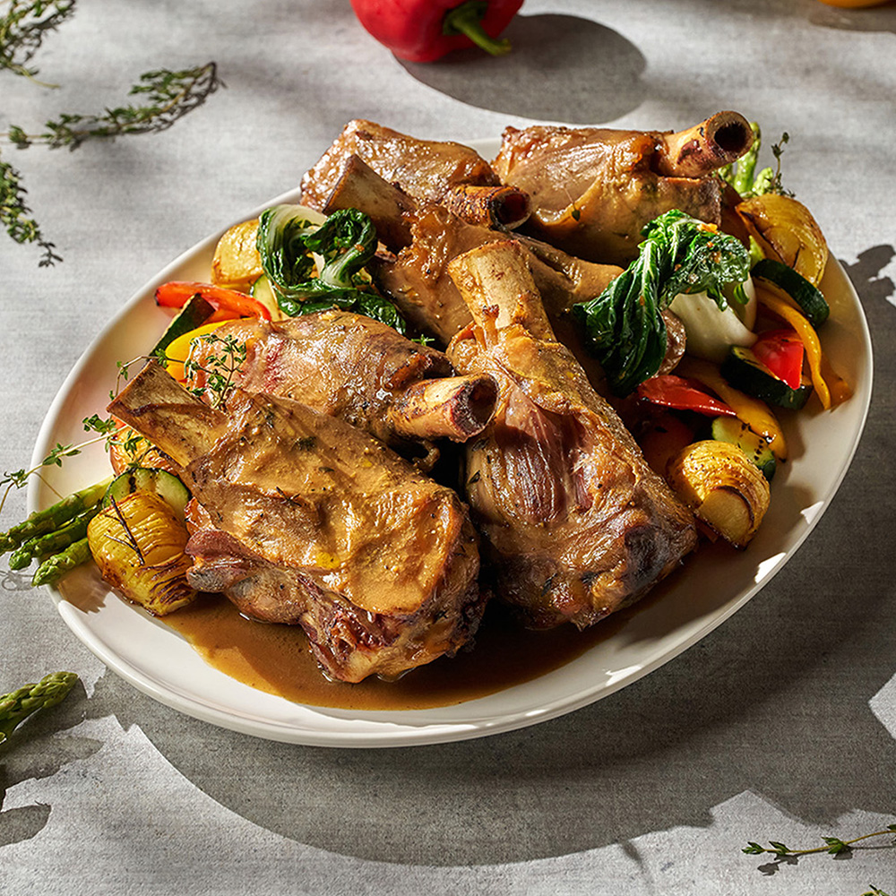 將小牛膝以黃芥末、橄欖油及百里香醃製入味,以低溫舒肥烹調,再烤至表面焦香,肉香鮮嫩,膠質豐厚,新年圍爐豪氣上桌。