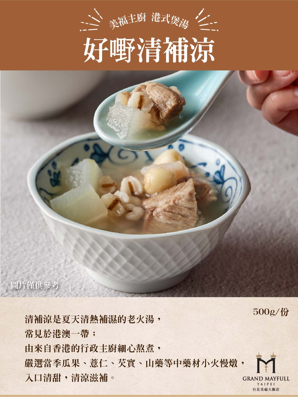 清補涼是夏天清熱補濕的老火湯,常見於港澳一帶;由來自香港的行政主廚細心熬煮,嚴選當季瓜果、薏仁、芡實、山藥等中藥材小火慢燉,入口清甜,清涼滋補。豬原料產地:台灣