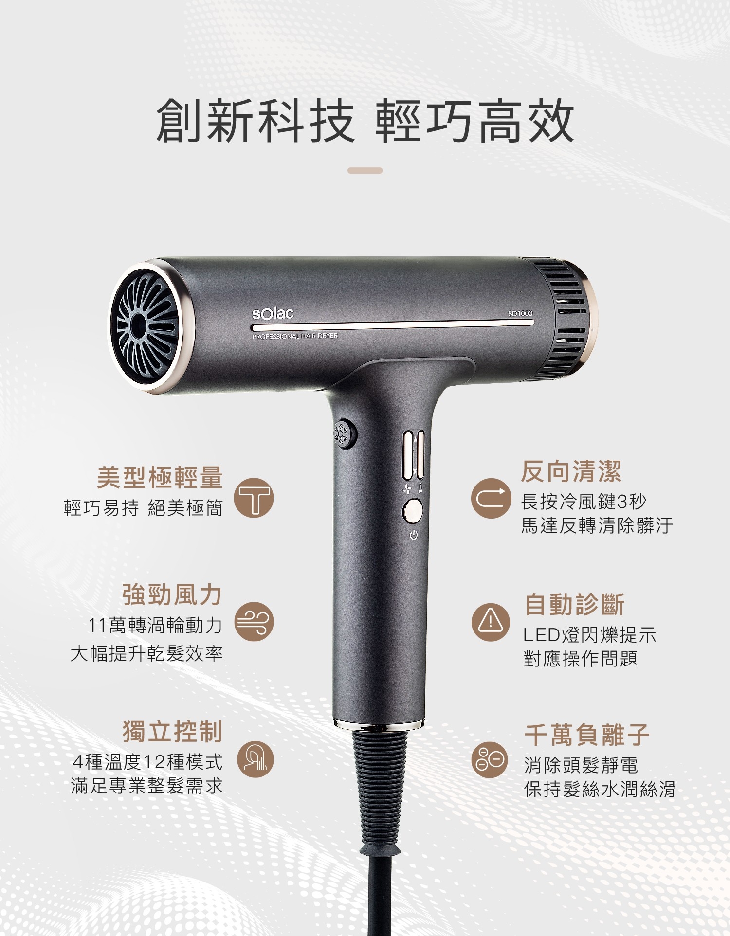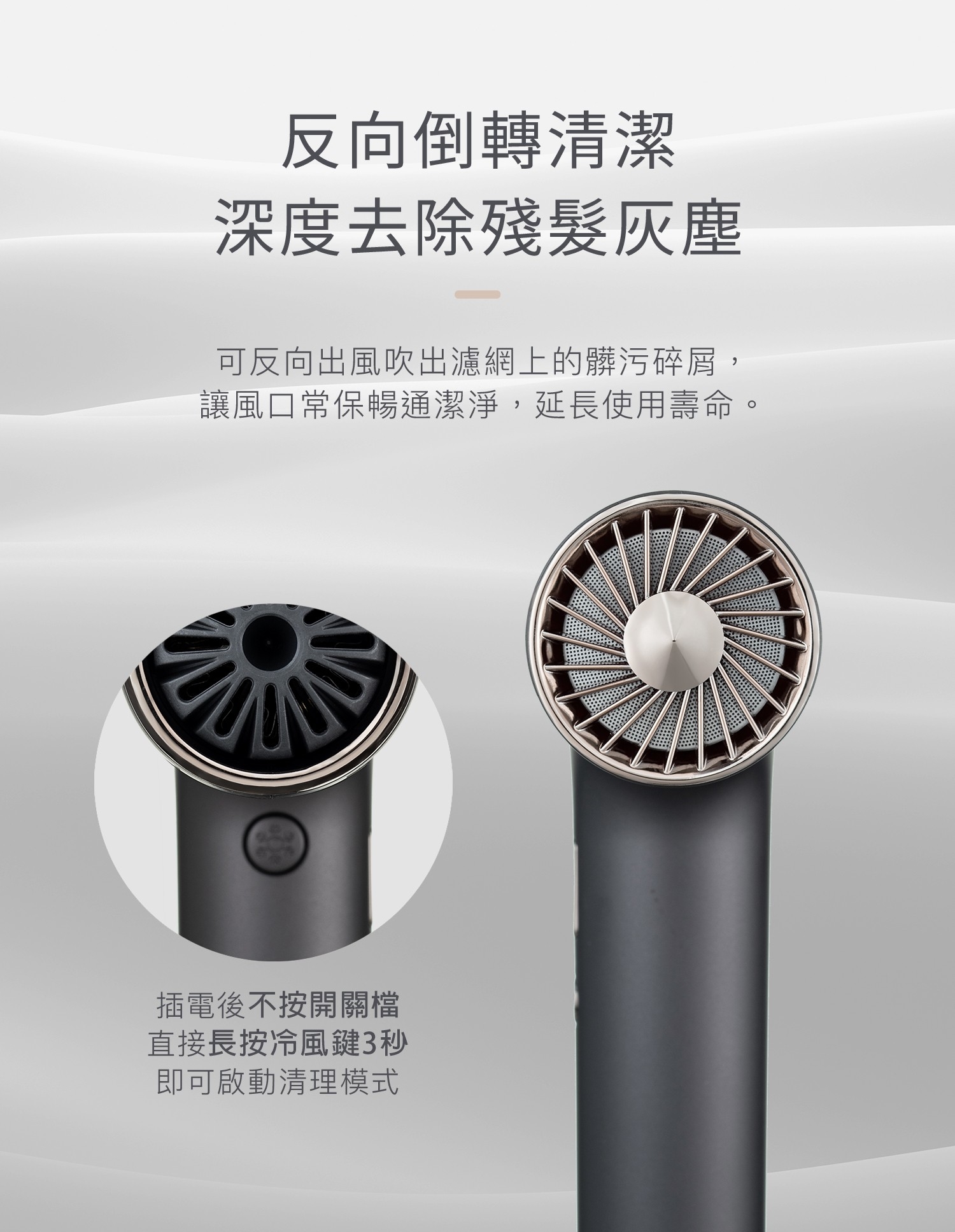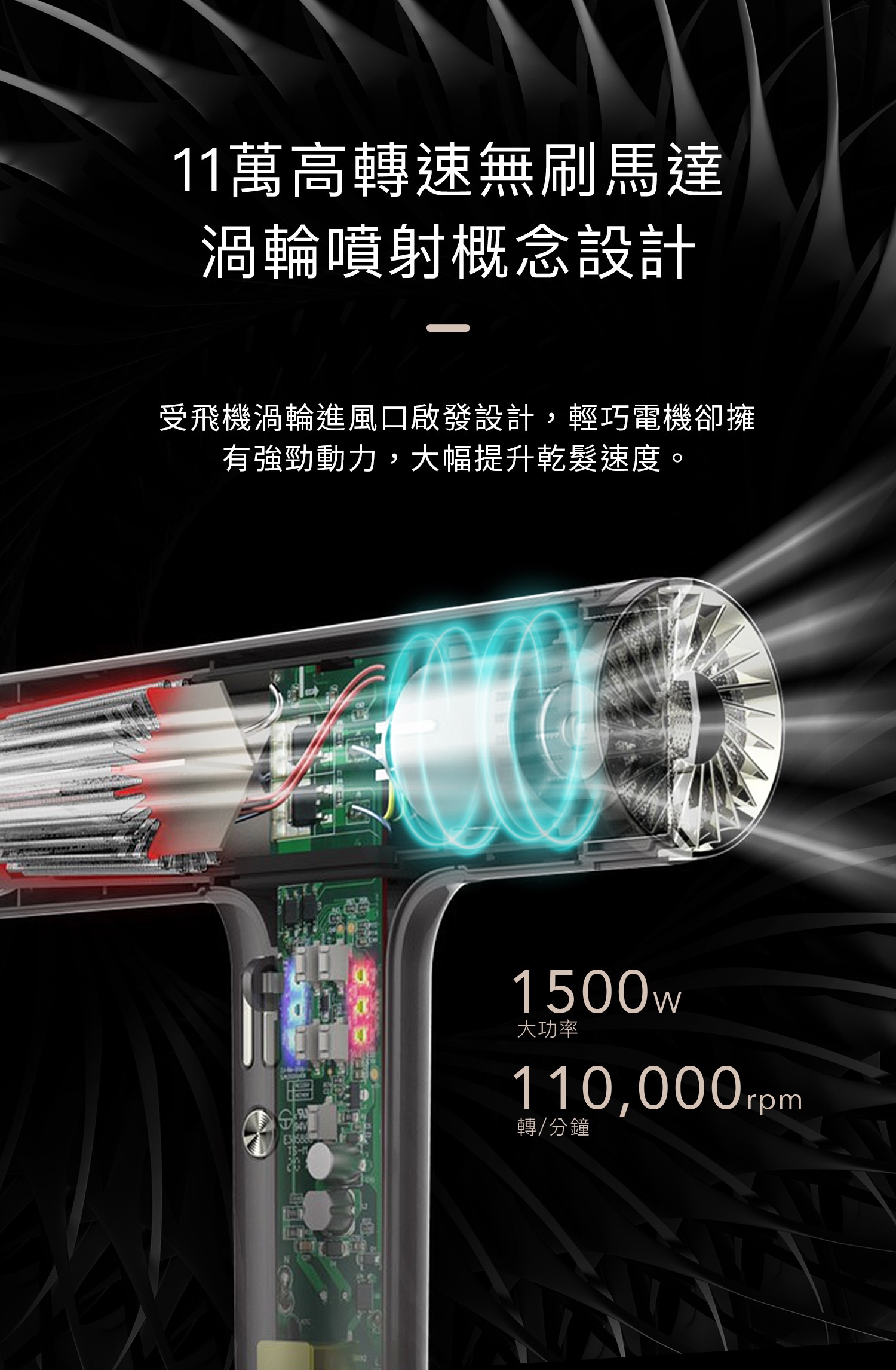 .DC無刷馬達轉速可達11000rpm,風力強勁乾髮速度快30~40%。
