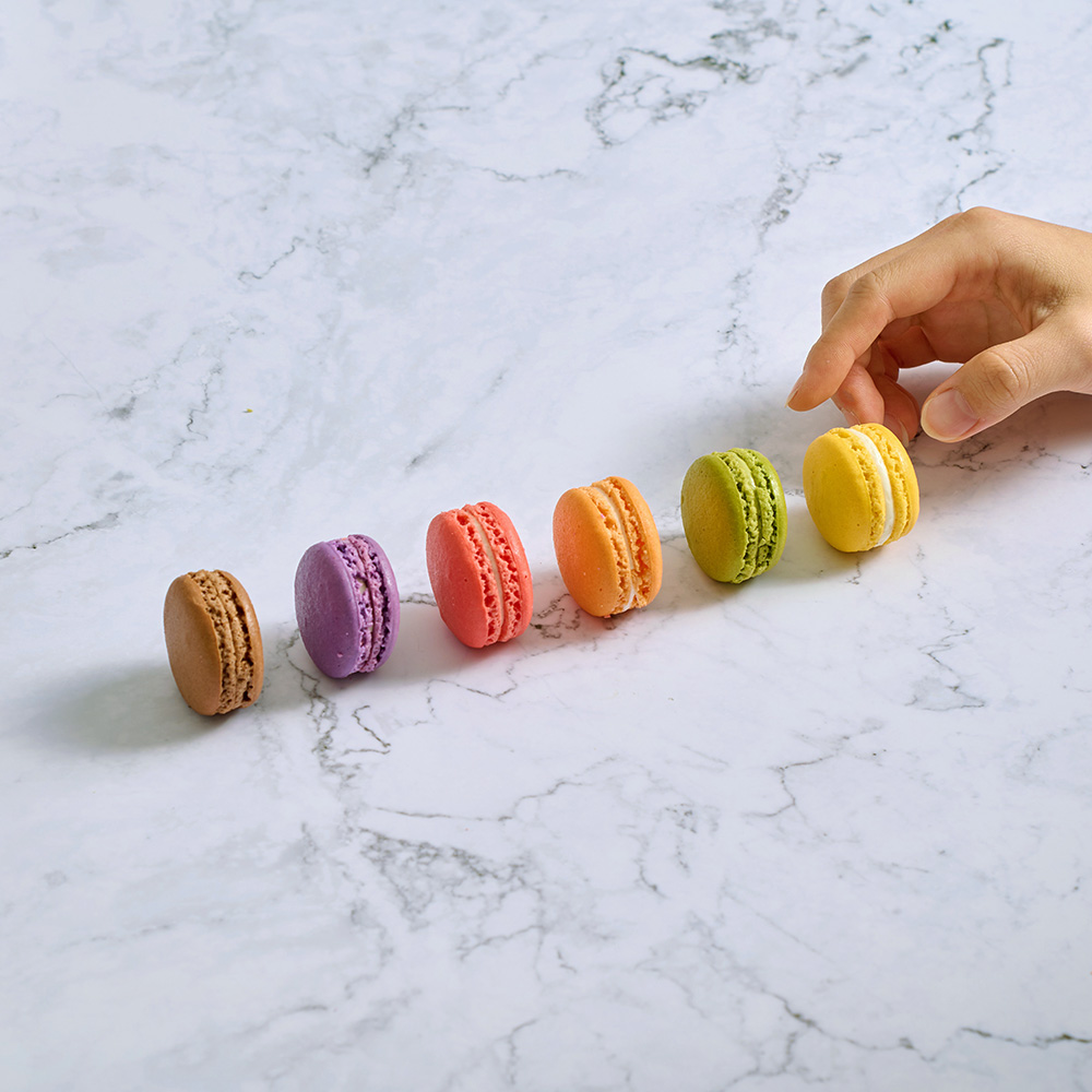 內容物:馬卡龍專用糖粉、杏仁粉、雞蛋白、奶油、栗子抹醬、日本柚子丁、比利時72%調溫巧克力、泰莓果泥、百香果果泥、黑醋栗果泥、可可粉、特級抹茶粉