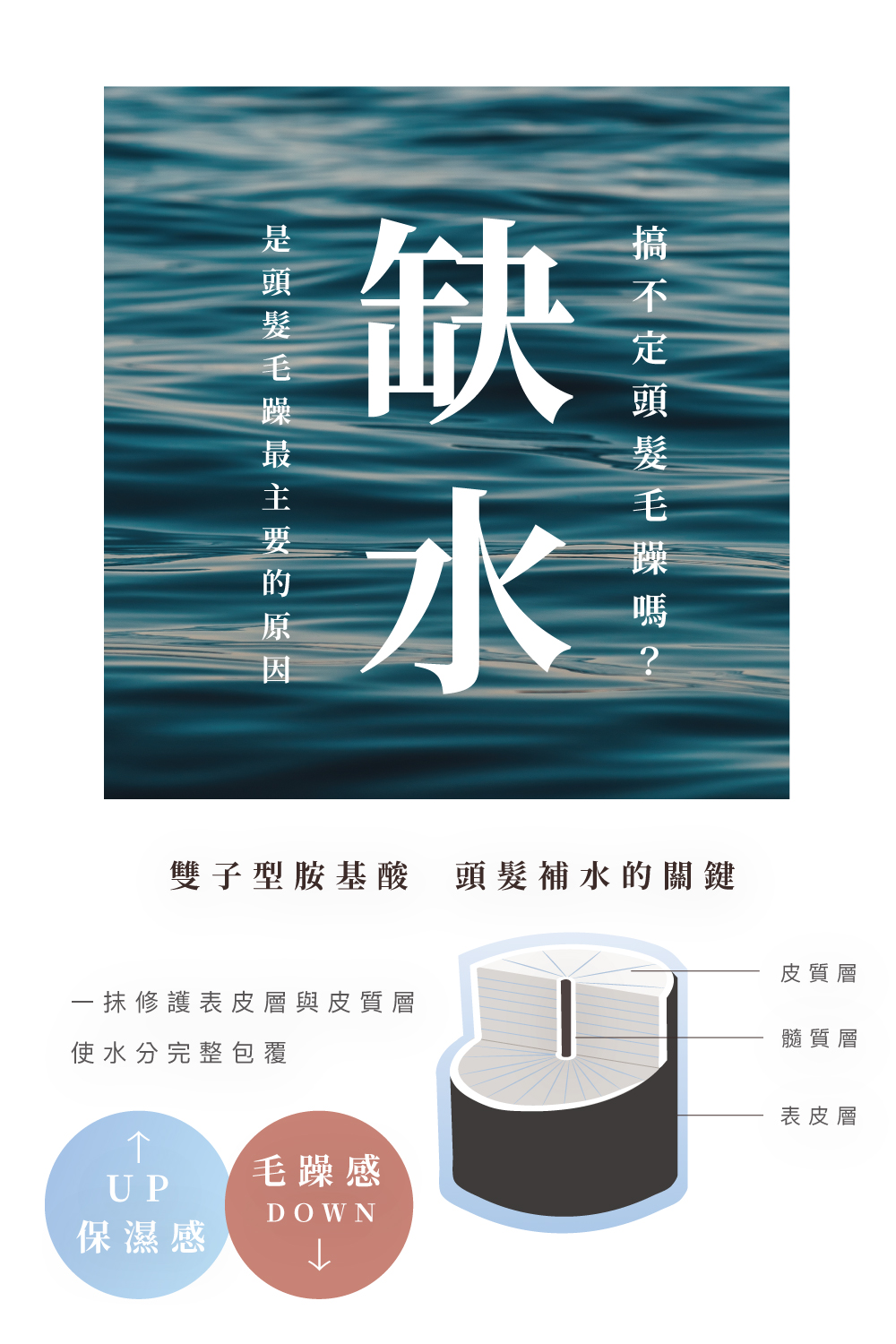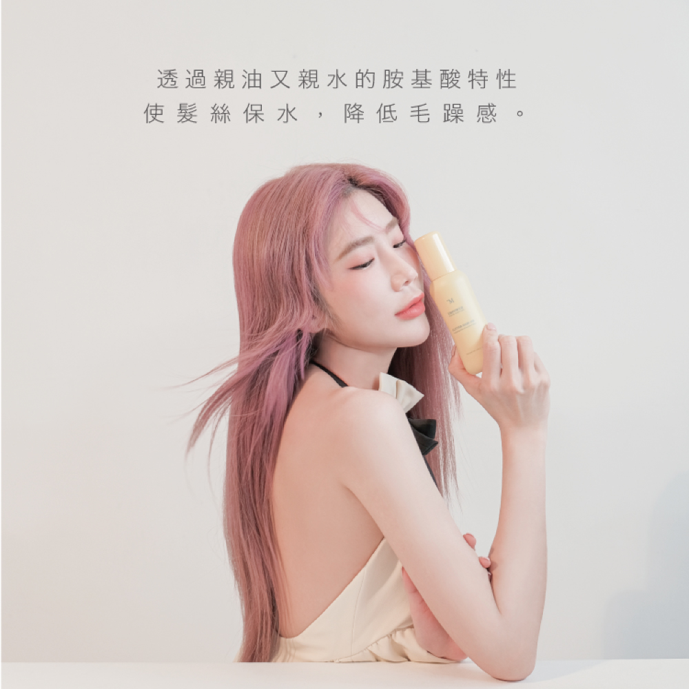 添加雙子型胺基酸,透過親油又親水的胺基酸特性,能夠幫助髮絲內部結構抓住油脂與水分,使髮絲保水,降低毛躁感。