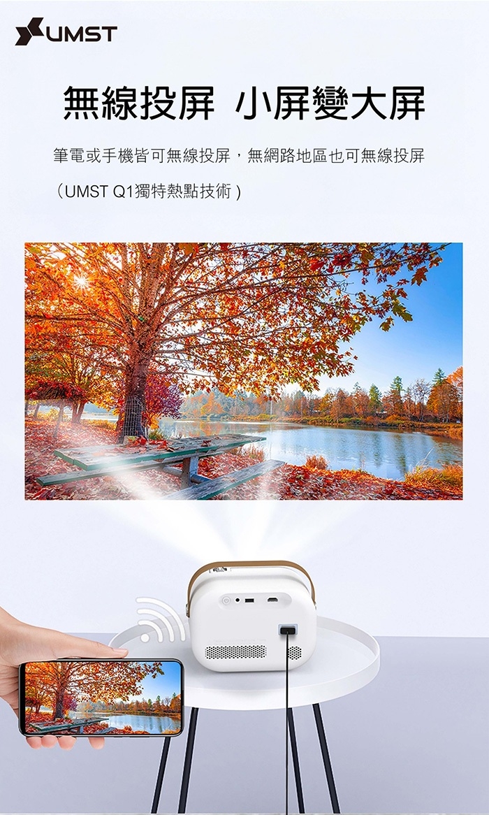 ・筆電或手機皆可無線投屏,無網路地區也可無線投屏(UMST Q1獨特熱點技術)
