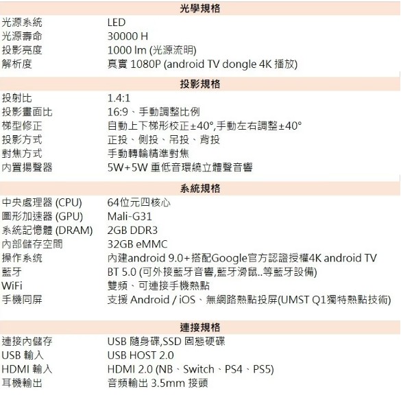 ※產品配件:UMST Q1、遙控器、腳架、電源線、說明書