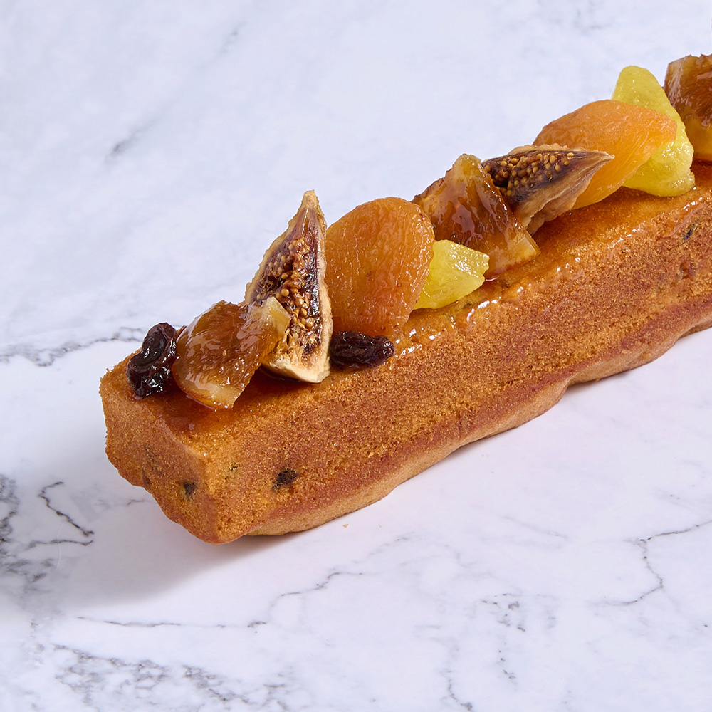 滿載果香的磅蛋糕,表面點綴無花果、鳳梨乾、杏桃乾與葡萄乾,口感紮實,散發繽紛視覺與自然甜香。