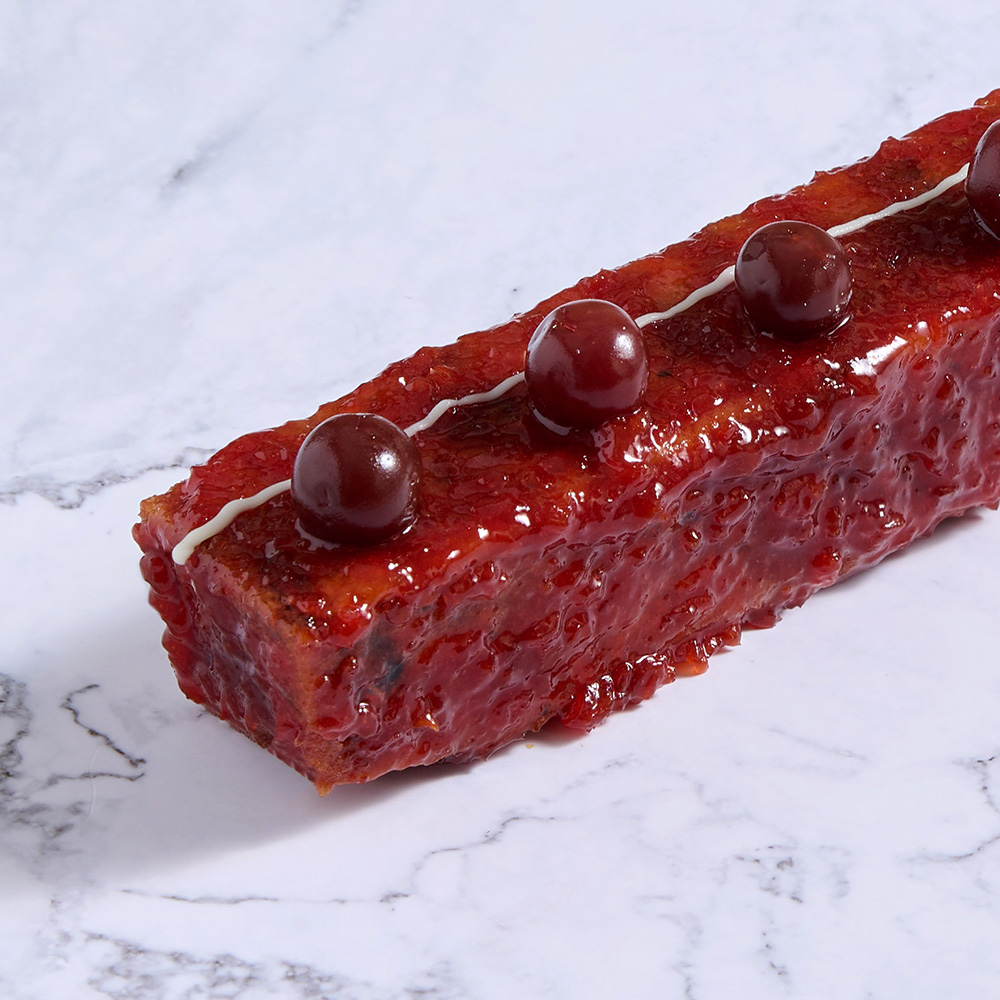 有別於常見磅蛋糕,外層包裹著綜合莓果醬,有著濕潤口感,酸甜果香層層漫開,頂部以酒漬櫻桃與白巧克力線條點綴,內餡藏有葡萄乾,果韻濃郁香甜。